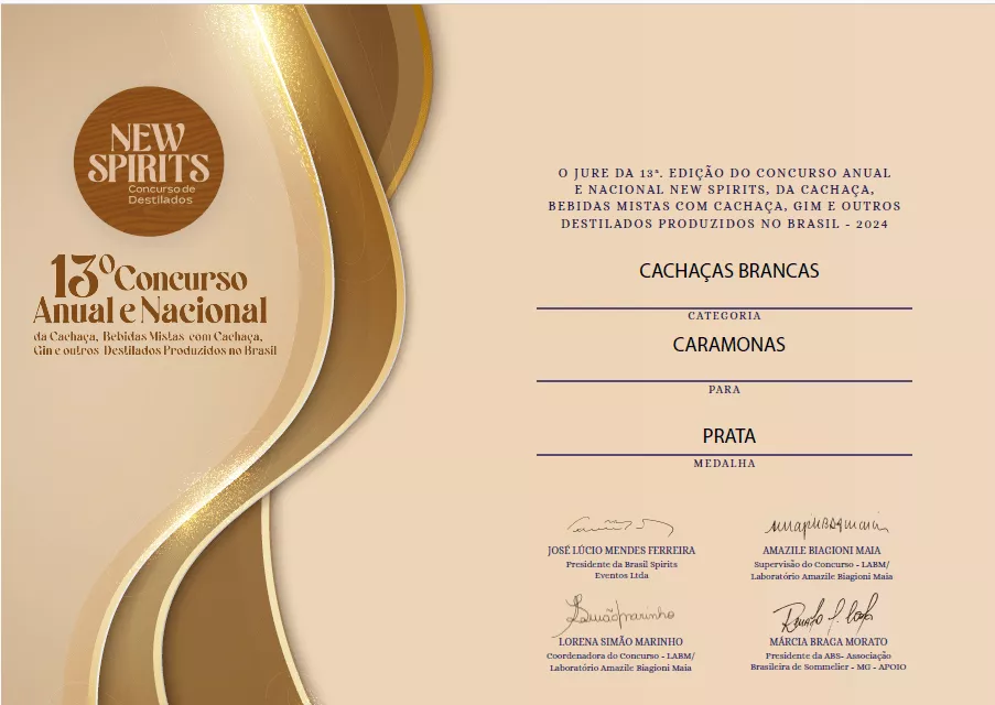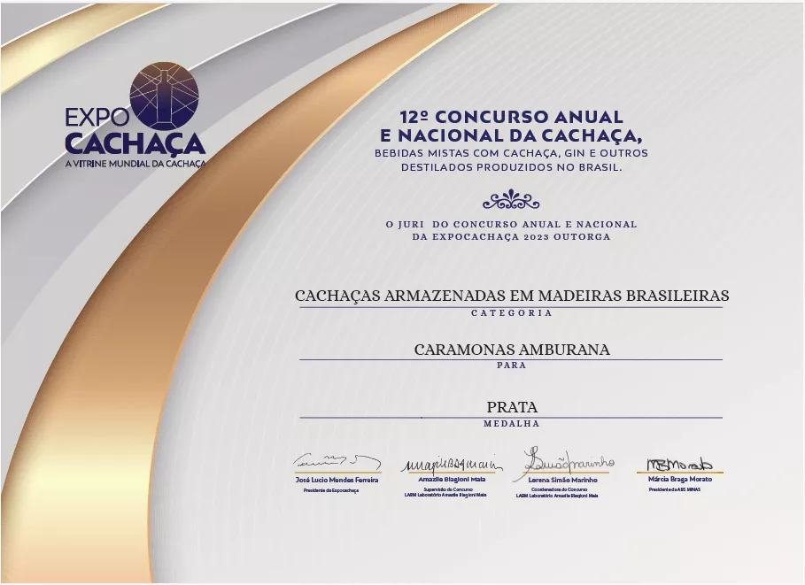 Nuestras cachaças Prata (acero inoxidable) y Amburana (amburana) fueron reconocidas a nivel nacional e internacional, ganando medallas de plata en los concursos Expocachaça 2023, Concurso de Vinos y Espirituosos 2023 (categoría Cachaça Amburana) y Nuevos Espíritus 2024 (categoría Cachaça Prata). Además, contamos con el sello de envejecimiento sostenible, que avala nuestro compromiso con las prácticas de producción responsables.