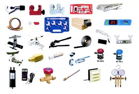 Cortador de tubos, Herramientas de flaqueo, Dobladores de tubo, Llave de trinquete, Válvulas, Accesorios de latón, Mango y bisagra, Termómetros, Enderezadores de aletas, Separadores de aceite, Receptor de refrigerante, Condensadores, Acumuladores, Tubos de aislamiento / Hojas / cintas, Colector, Mangueras de carga, Acopladores rápidos, Multi medidores, Detector de fugas, Drenaje de aire... etcetera